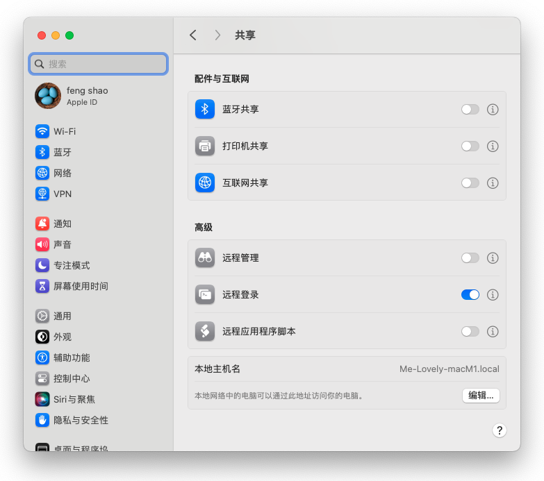 3. 在“共享”设置中,选中“远程登录”复选框。这将启动 SSH 服务,默认情况下,它将在端口 22 上运行。